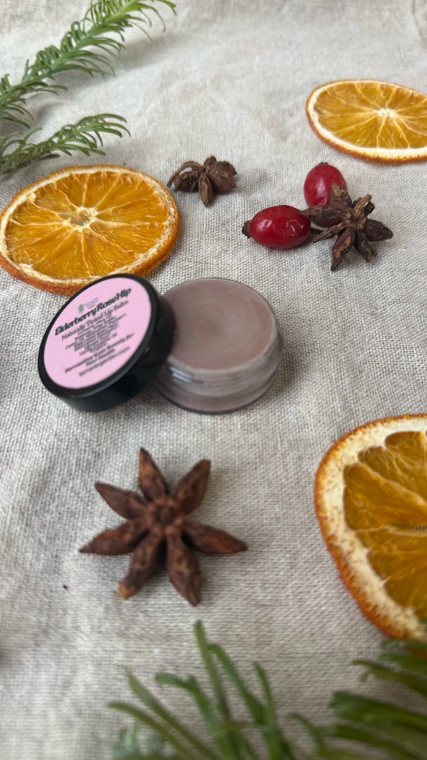 Elderberry Rose Hip- Beeswax, Olive Oil, Wildcrafted Plantain Leaf*, Wildcrafted Rose Hip*, Wildcrafted Elderberry*, Castor Oil, Alkanet Root, Vanilla Essential Oil