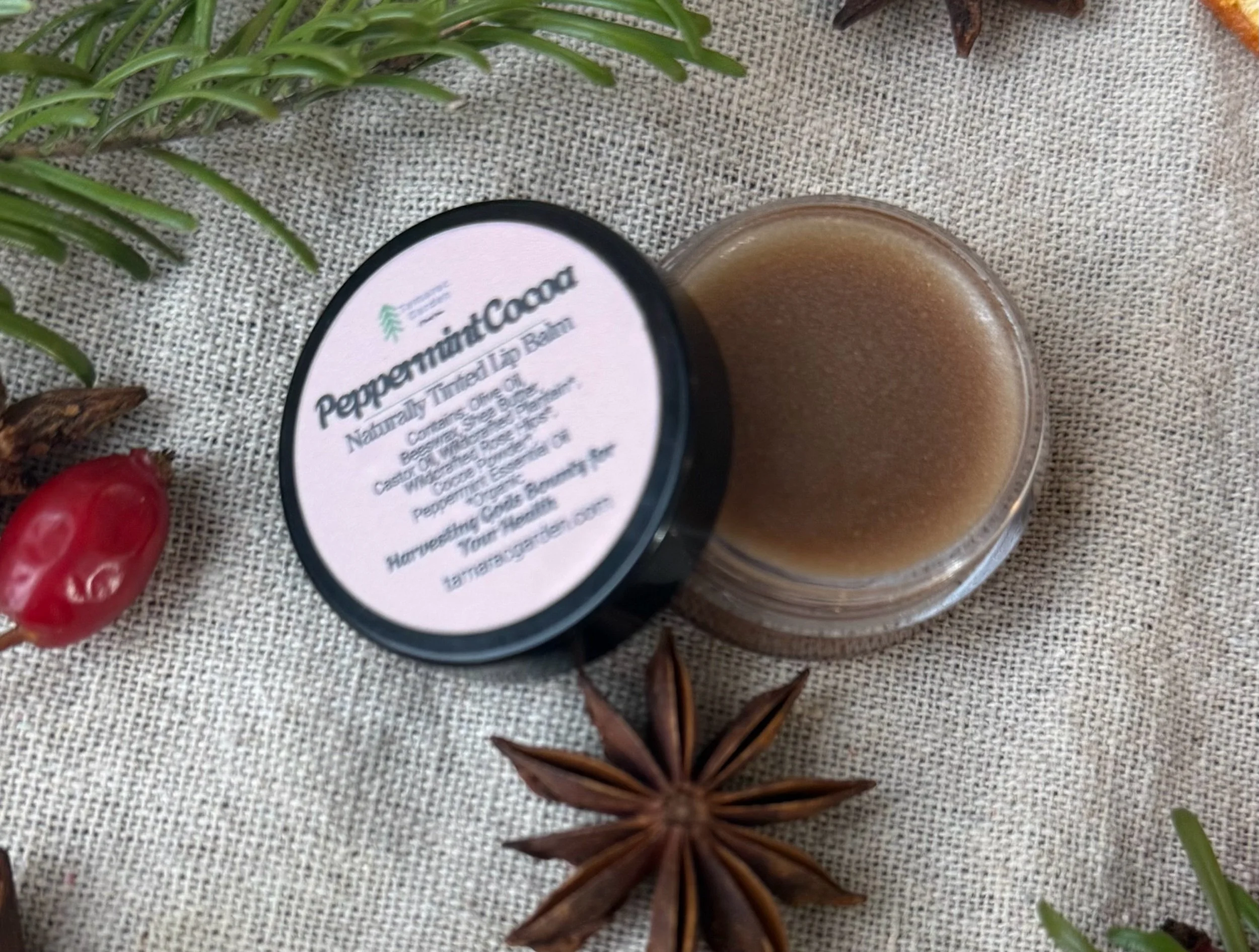 Peppermint Cocoa- Beeswax, Olive Oil, Wildcrafted Plantain Leaf*, Wildcrafted Rose Hip*, Castor Oil, Cocoa Powder*, Peppermint Essential Oil