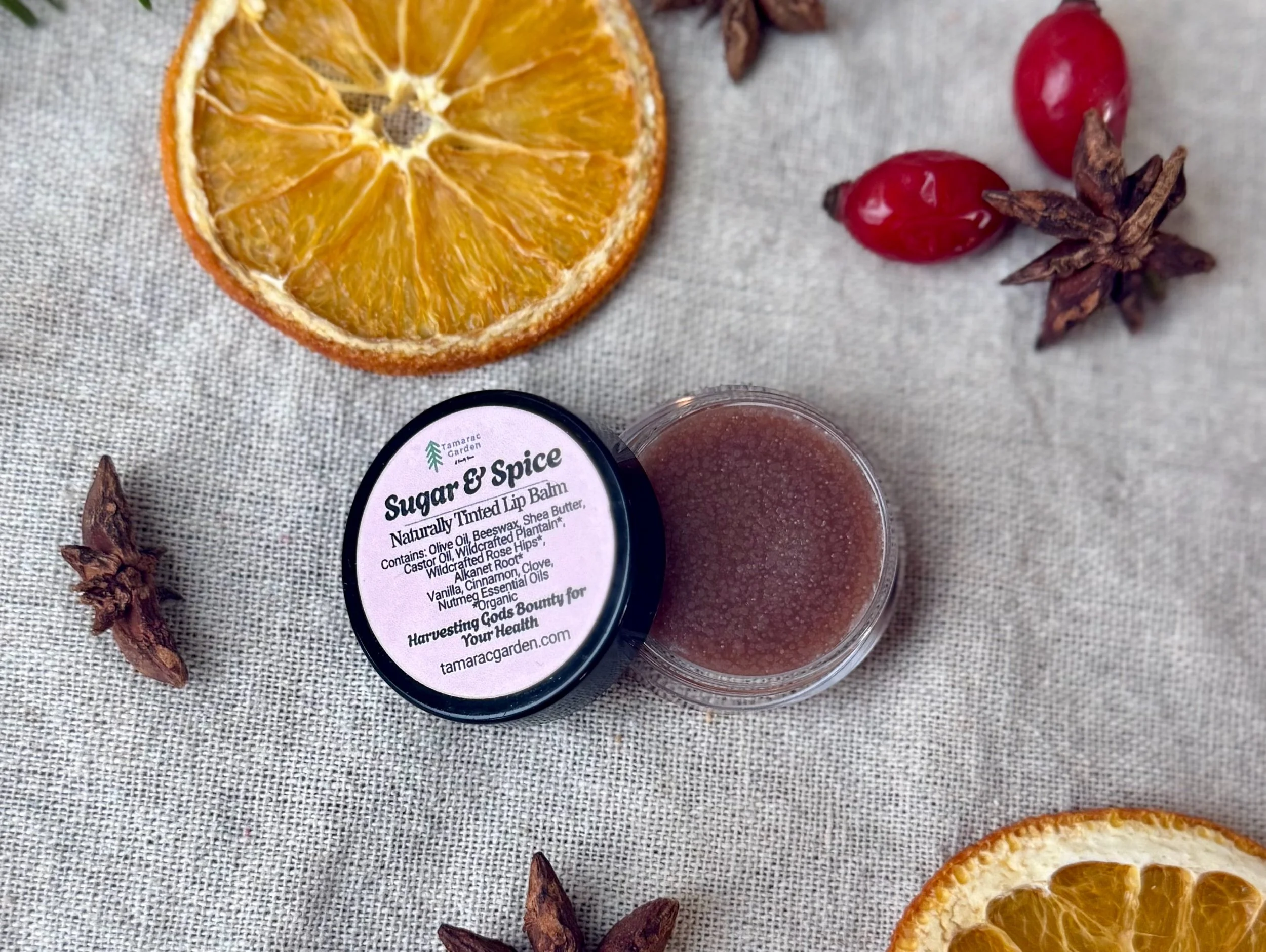 Sugar & Spice- Beeswax, Olive Oil, Wildcrafted Plantain Leaf*, Wildcrafted Rose Hip*, Castor Oil, Alkanet Root, Vanilla Essential Oil, Cinnamon Essential Oil, Clove Essential Oil, Nutmeg Essential Oil